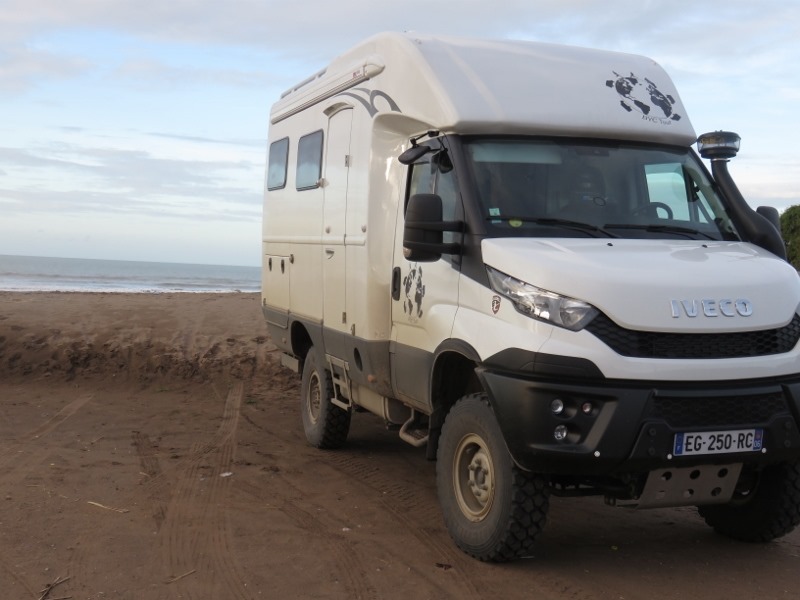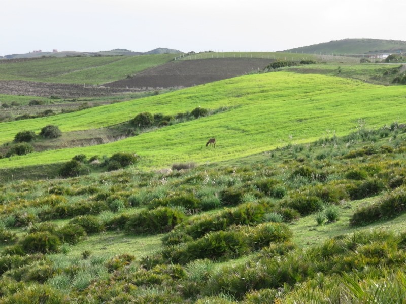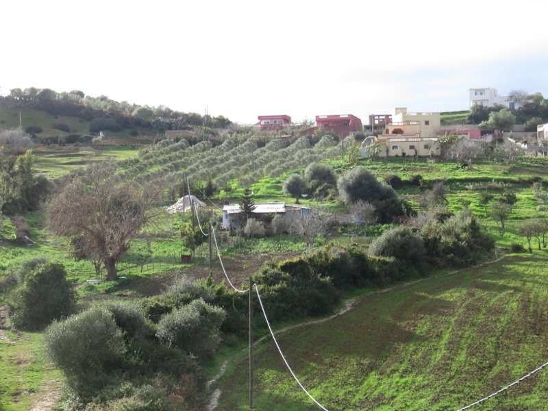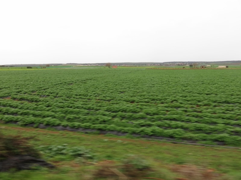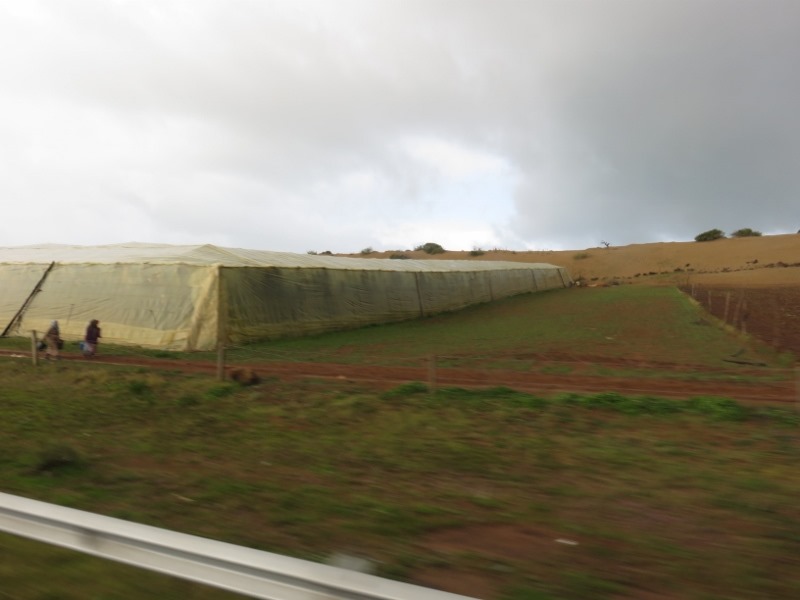 Beaucoup de pluie dans la nuit, on décide alors de descendre vers le Sud plus rapidement, par les grands axes. Paysages très verts. Grandes plaines fertiles du Maroc. Champs de menthe, de blé, de légumes, d’ananas, de pommes de terre à perte de vue. Beaucoup de travail manuel. Des fraises sous mini serres, des agrumes,……