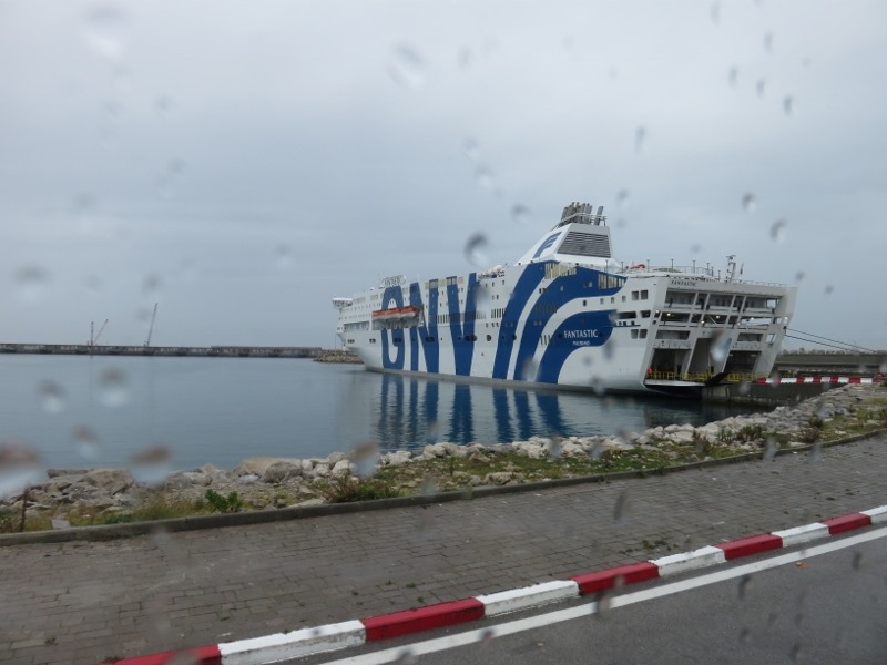 Embarquement du véhicule sur le ferry de la compagnie GNV. Des vents violents sont annoncés. Notre camion sera arrimé !!