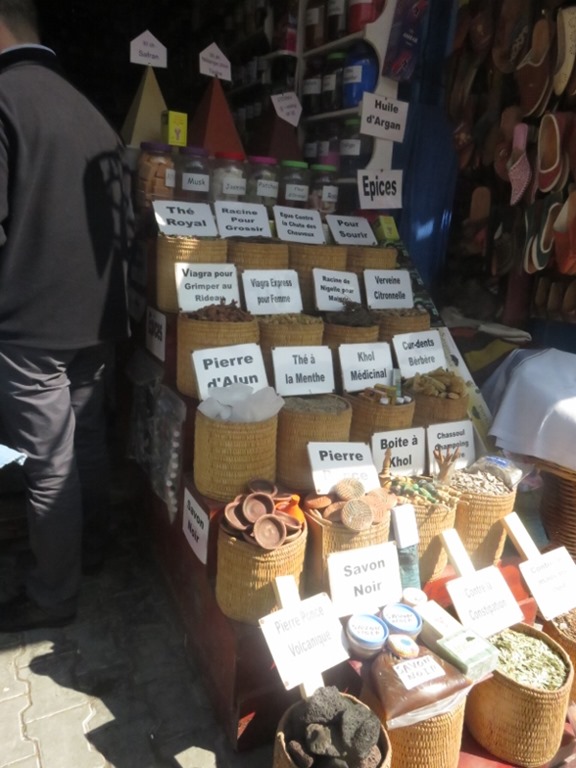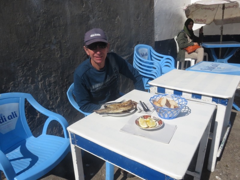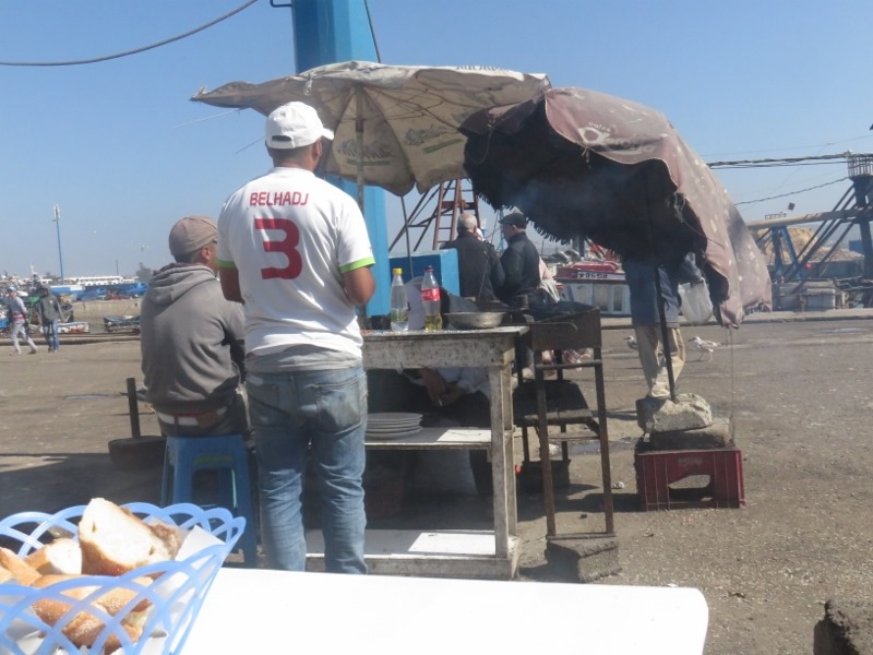 Pour le déjeuner, ce sera “local” sur le port, dans une gargote qui fait griller le poisson du jour sous vos yeux : super bon (60dh pour une daurade grillée, 70dh pour un calamar grillé)