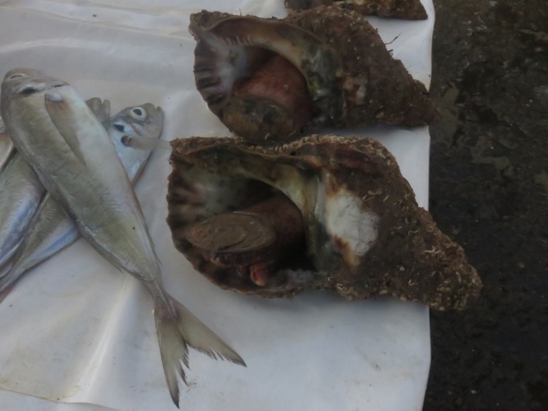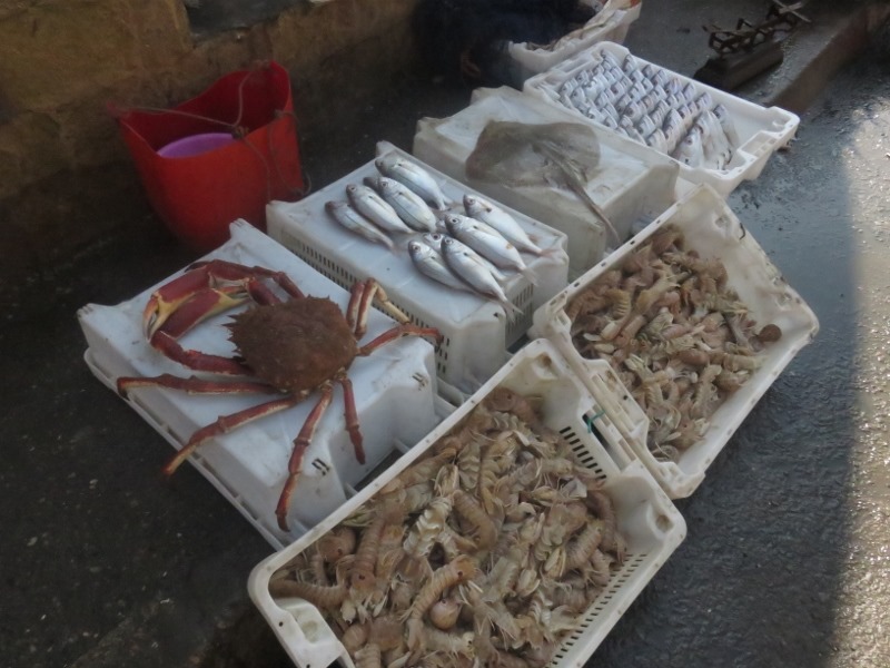 Port de pêche actif. Les bateaux arrivent avec leurs prises. C’est de la pêche au filet. Sur le port, les pécheurs vendent leurs poissons et réparent leurs filets.