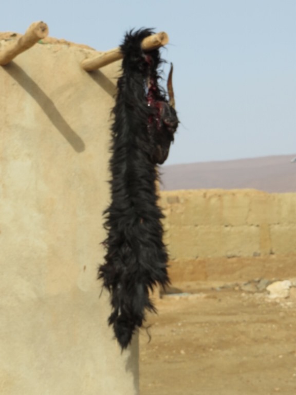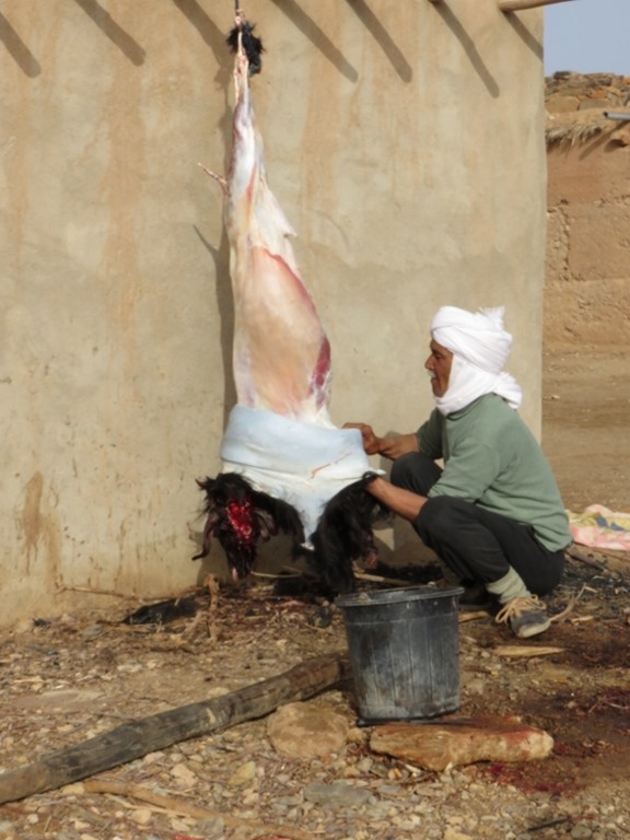 Le boucher est déjà à son affaire. Il épluche d’une chèvre.