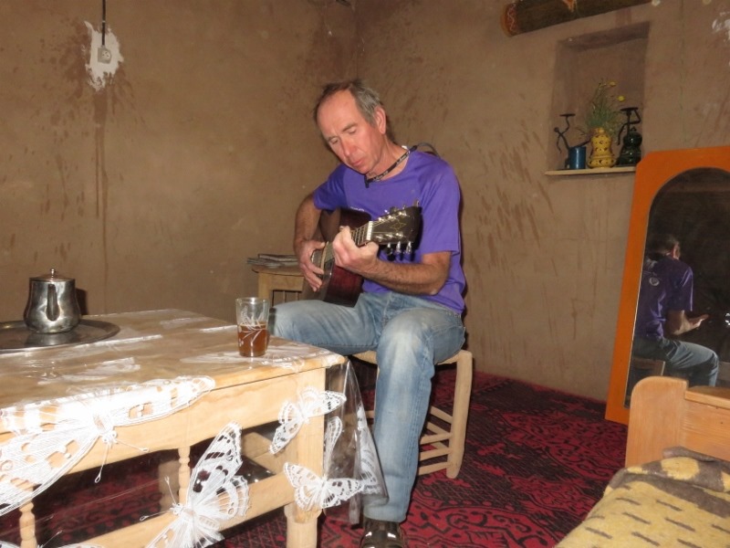 Moment musical avec guitare, Atmane joue et chante de la musique berbère et Yvan de la musique française, autour d’un thé naturellement.