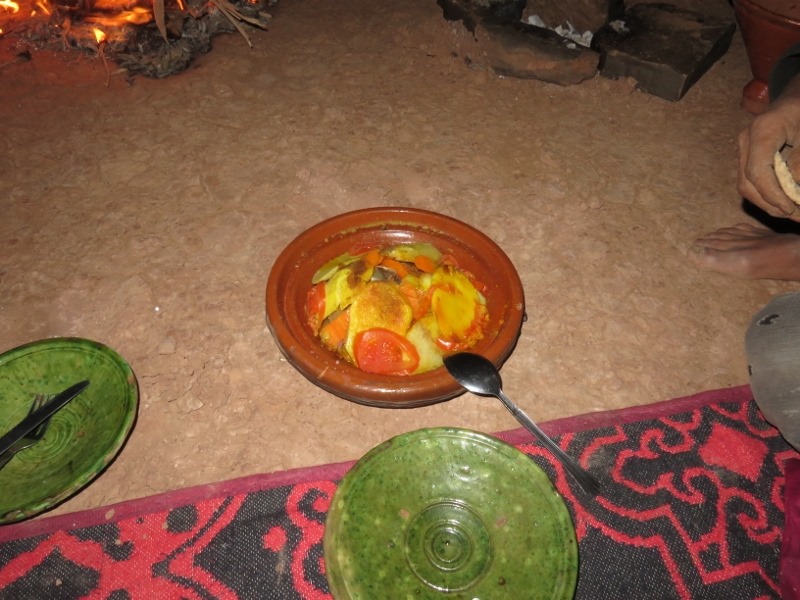 La soirée continue avec la préparation d’une tajine au feu de bois. On laisse mijoter la tajine tout en se réchauffant autour du feu.