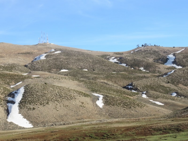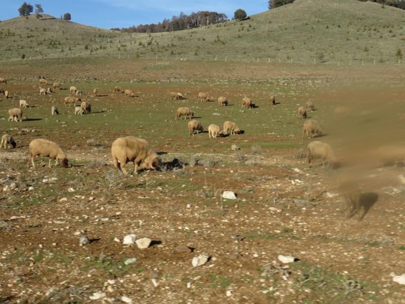 Poursuite de notre route vers le Parc National d’Ifrane. On est passé dans le Moyen Atlas : paysages de montagnes verts. La route est haute (jusqu’à 2100 mètres et il fait jusqu’à 28°). La neige n’est pas loin et les névés tout proches. Même à haute altitude, les paysages sont verts, les troupeaux de moutons paissent tranquillement.