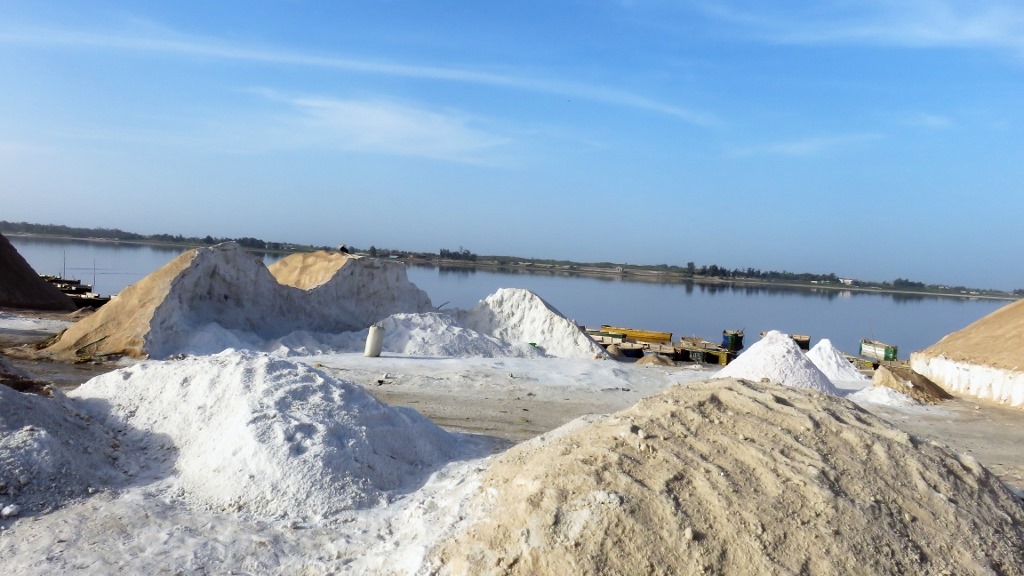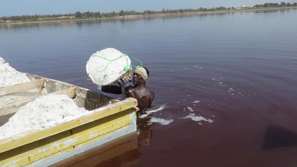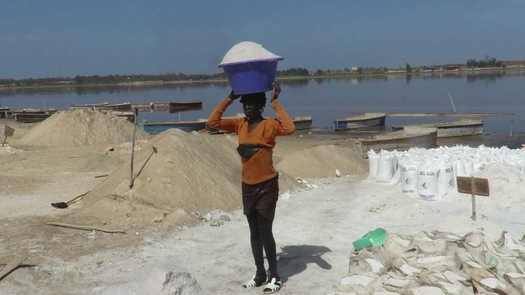 Le sel extrait manuellement du fond du lac est ramené sur la terre en pirogue, déchargé par les femmes, mis en sac manuellement avant d’être exporté par camion vers les pays de l’Afrique de l’ouest