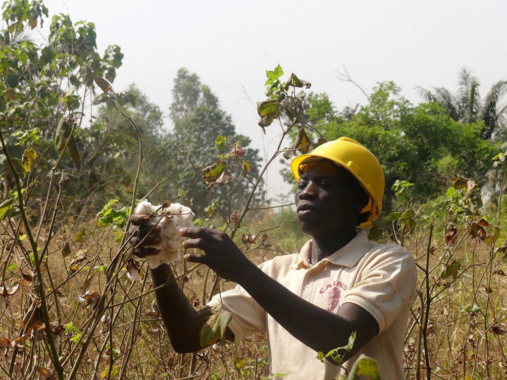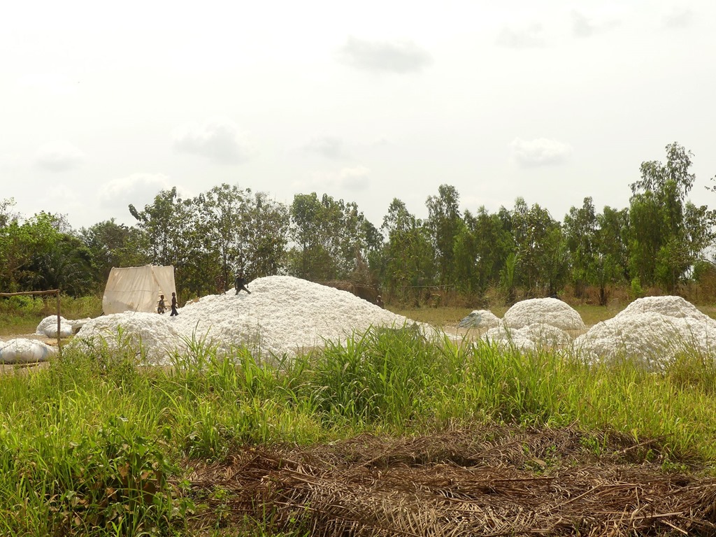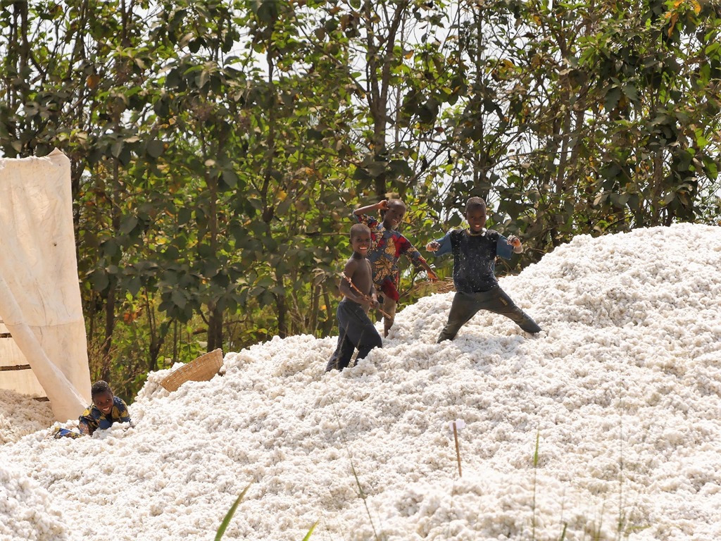 Beaucoup de culture du coton : une fois les fleurs ramassées en tas, tout en s’amusant, les enfants le chargent dans des camions pour être transporté à la filature.
