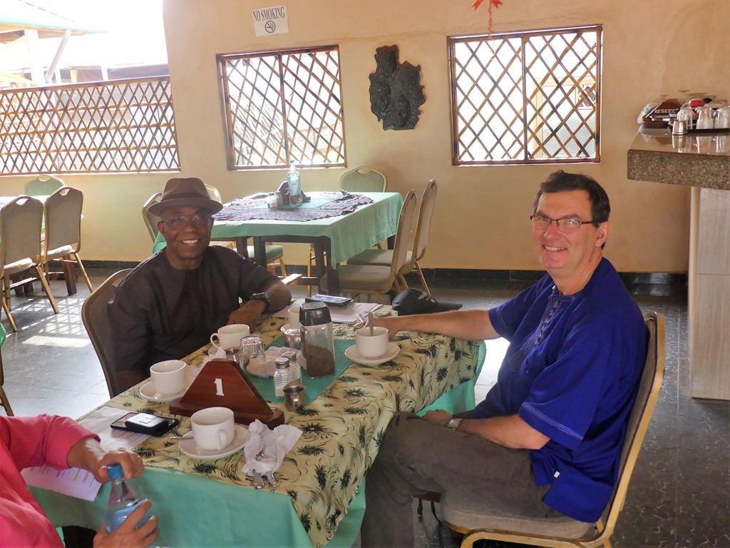 Au centre Songhai on rencontrera Erwan Dianteill “Professeur Universitaire à la Sorbonne, Anthropologie des Religions” qui vient depuis plus de 10 ans et avec qui nous tenterons de faire vulgarisation du Vaudou au cours des petits déjeuners pris ensemble. Ici en compagnie du Maitre des lieux Godfrey.