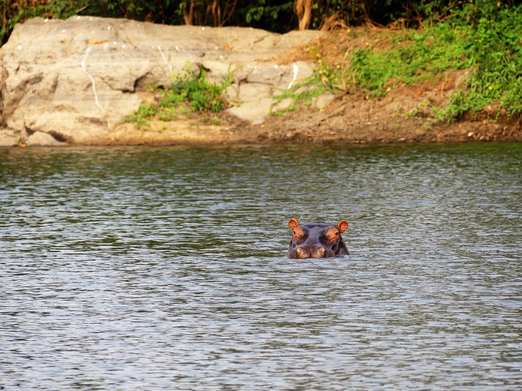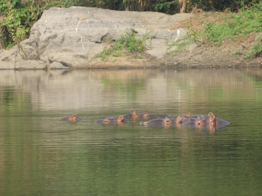 Sur l’Ouémé, il ne faut pas s’arrêter n’importe où. Dans la famille Hippopotame, voici le père, la mère et les enfants. Face à nous, ils nous surveillent. Ils grognent et attendent que l’on parte pour sortir de l’eau et aller manger.On ne s’approchera pas plus.