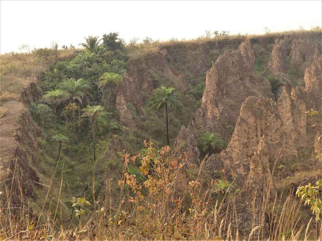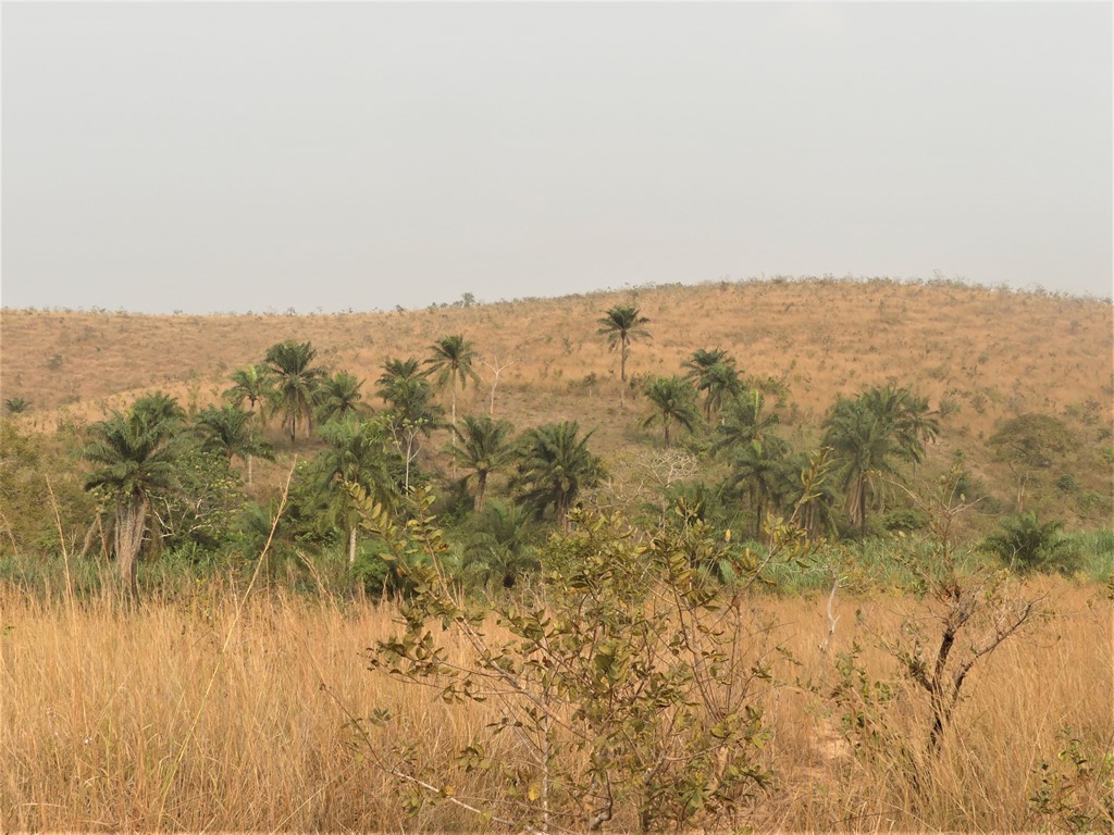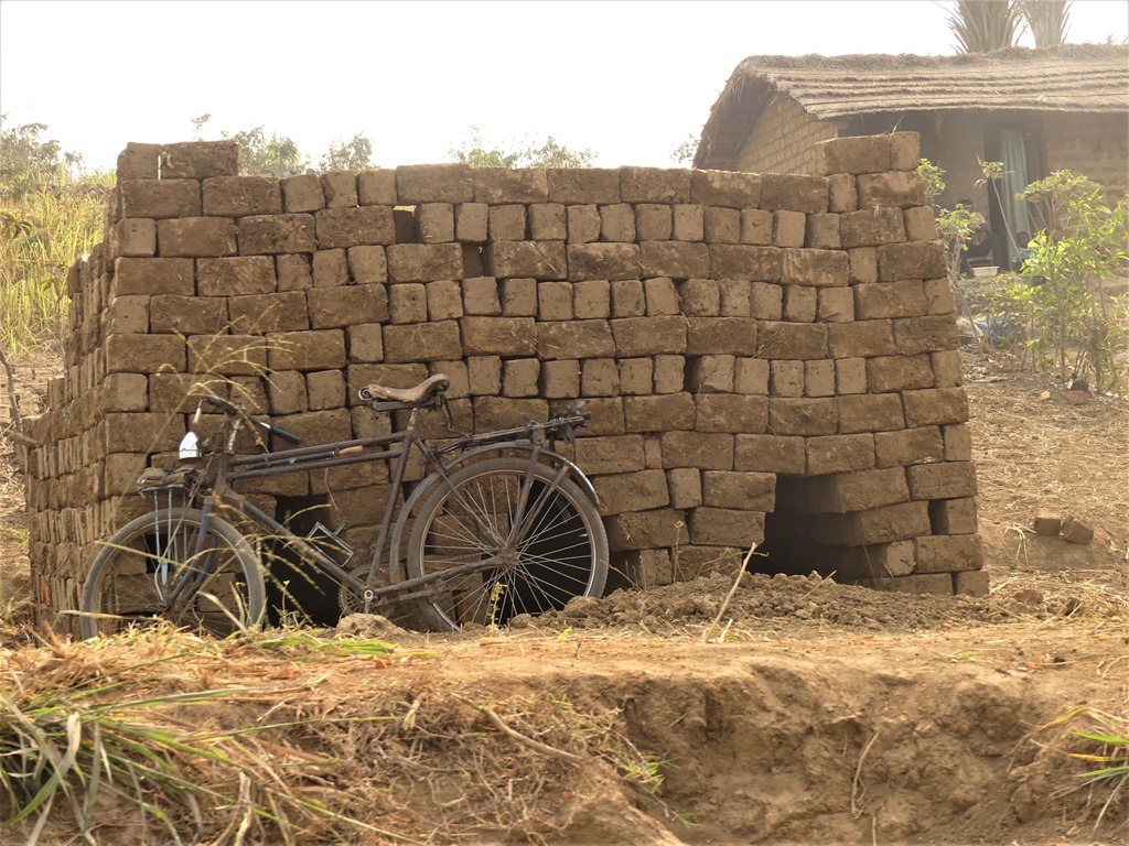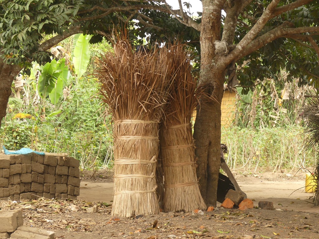 On traverse des très beaux paysages dans un relief de mamelons que l’on monte et redescend, de savanes colorées entrecoupées d’oasis de palmiers et de grands arbres verts. On voit au loin la piste come une déchirure sur le flanc des collines éloignées et d’où nous sommes on se demande chaque fois si on va arriver à monter. Peu de villages, peu de population, pas de circulation tout au plus quelques motocyclettes. A notre rythme, on bivouaque près des villages aux maisons de briques rouges façonnées et cuites sur place avec des toits de brande naturelle.
