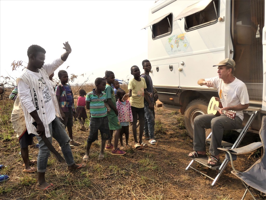 Dans l’un des villages de brousse où l’on bivouaquera, le Chef du village nous accueille et au cours de la conversation nous dit avoir été musicien et chanteur dans ses plus jeunes années. Qu’à cela ne tienne, Yvan lui prête sa guitare et le voilà en train de retrouver ses émotions. Un semblant de concert en live.
